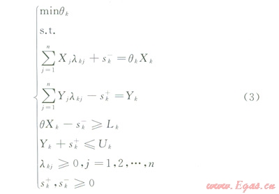 通過式(3)求解,可以得到在有邊界約束條件下第k個決策單元的綜合效率評價指數(shù)(即相對有效性值)qk以及參數(shù)lk和各松弛變量s`k,sk+的最優(yōu)解qk*、lk*、s`k*、sk+*。
