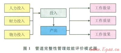 美國學(xué)者格朗蘭德認為,評價一測量(量的記述)或非測量(質(zhì)的記述)+價值判斷[20]。也就是說評價是在量(或質(zhì))記述的基礎(chǔ)上進行價值判斷的活動。管道完整性管理作為一種資源轉(zhuǎn)換系統(tǒng),通過一定的人、財、物的投入(量的記述),獲得一定的產(chǎn)出,如工作完成數(shù)量(量的記述)、工作完成質(zhì)量(質(zhì)的記述)和工作效果(質(zhì)的記述)等,最終達到管道風(fēng)險可控、安全、經(jīng)濟運行的目的。對這種資源轉(zhuǎn)換系統(tǒng),筆者采用了經(jīng)典的評價模式——“生產(chǎn)函數(shù)”模式,即“投入產(chǎn)出”評價模式。考慮到數(shù)據(jù)的可獲得性與可操作性,舍去了一些對效能水平影響不大、非共性的因素,提出了如圖1所示的效能評價模式。