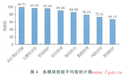 本次評價針對各模塊都進行了評價,統(tǒng)計結(jié)果見表4。對7條線路管道完整性管理總體效能評價的結(jié)果見圖3。7條線路各業(yè)務(wù)模塊效能平均值統(tǒng)計如圖4所示。