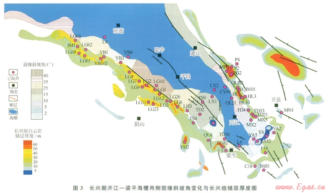 圖3是利用以上方法得到的開江 梁平海槽兩側(cè)臺地前緣斜坡角大小的粗略圖。該圖顯示,開江梁平海槽兩側(cè)前緣斜坡角度變化自北向南呈現(xiàn)不均一變化,海槽北部和中部臺地前緣斜坡角度相對較大,一般大于l0°,最大可達60°,海槽兩側(cè)臺地邊緣帶凸起明顯,發(fā)育明顯坡折帶;海槽南部前緣斜坡角度普遍較小,多數(shù)小于l0°,整體表現(xiàn)為西陡南緩的大型箕狀寬緩斜坡。