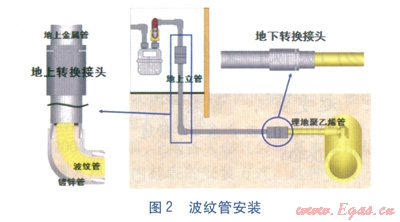 波紋管安裝方法簡單(見圖2),先在庭院靠近樓房的位置開挖一小坑,外露埋地的引入鍍鋅鋼管,將鍍鋅鋼管隔離。然后在地上引入管距地面約lm處拆開接口或引入管閥門,利用專用工具設(shè)備及按照廠家提供的操作指引,將波紋管從地上引入管開口一端推進鍍鋅鋼管內(nèi),直至波紋管從鍍鋅鋼管另一端埋地開口導出。再利用特制的轉(zhuǎn)換接頭把兩端凸出的波紋管分別連接至地上金屬管和埋地聚乙烯管道,隨即進行壓力試驗。最后,向轉(zhuǎn)換接頭上附設(shè)的灌漿孔中注入水泥漿,填充波紋管與鍍鋅鋼管內(nèi)壁之間的空隙,至此修復工作完成。內(nèi)襯的波紋管受原來的鍍鋅鋼管保護,在一定程度上可降低外力影響。室內(nèi)安裝方法與此類似。