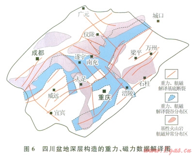 從重力、磁力處理結(jié)果的構(gòu)造解譯看,四川盆地深層構(gòu)造復雜,基底構(gòu)造形跡總體表現(xiàn)為NE向?;讛嗔岩?span lang="EN-US">NE向為主,規(guī)模最大的有華鎣山斷裂和龍泉山基底斷裂;川中地區(qū)發(fā)育Nw向基底斷裂,但多數(shù)受限于華鎣山斷裂和龍泉山基底斷裂之間(圖6)。通過對剩余重力異常、磁異常處理,突出深、淺部巖石磁性特征。以切割半徑為5km的2層切割剩余磁異常,向上延拓5km、10km、40km。結(jié)果表明,在綿陽、南充、大足、石柱等存在高磁異常,是盆地內(nèi)基性火山巖的響應,且緊鄰基底斷裂。對布格重力異常進行切割半徑為5km的1層切割法,求取剩余異常與區(qū)域異常。結(jié)果表明,除大足重力高之外,剩余重力異常呈NE向緊鄰磁異常高分布。結(jié)合巖性分析,認為結(jié)晶基底及花崗巖基底表現(xiàn)為弱異常、高重力異常;巨厚的沉積巖表現(xiàn)為弱磁異常及低重力異常;中—基性火山巖表現(xiàn)為高磁異常、中等剩余重力異常。依據(jù)上述信息,推測四川盆地深層存在裂谷盆地,總體表現(xiàn)為NE向展布,且受基底斷裂控制。裂谷兩側(cè)發(fā)育斷裂與基性火山巖伴生,可能是裂谷初期火山活動的表現(xiàn)。根據(jù)區(qū)域資料推測,這套中一基性火山巖可能與川西—滇中裂谷充填的巨厚蘇雄組及川中女基井鉆遇的蘇雄組火山巖為同期產(chǎn)物距今時間介于803~760Ma之間。而緊鄰火山巖分布為裂谷沉積物充填,表現(xiàn)為重力低值區(qū)。需要指出,在重慶、涪陵、南充、遂寧一帶,存在受NW向斷裂控制的裂谷發(fā)育區(qū),在地震剖面上有較清楚的反射特征響應,尤其是遂寧大足之間的基底斷裂在地震反射剖面上響應特征更為明顯。