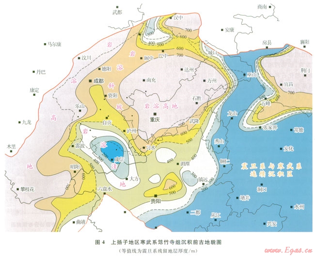 近期研究表明,上揚子地區(qū)在震旦紀—早寒武世早期發(fā)生了3幕桐灣運動。桐灣運動Ⅰ幕發(fā)生在燈二段末期,Ⅱ幕發(fā)生在燈影組末期,Ⅲ幕發(fā)生在梅樹村末期。運動性質(zhì)均表現(xiàn)為整體抬升。受其影響,燈二段、燈四段形成了兩套風化殼型巖溶儲層。露頭及鉆井資料證實,兩套巖溶儲層不僅在威遠、磨溪、高石梯等古隆起區(qū)發(fā)育,而且在貴州仁懷的桐梓剖面、凱里的基東剖面以及鄂西地區(qū)的利l井等,均可見風化殼型巖溶儲層。把現(xiàn)有的資料點投在上揚子地區(qū)筇竹寺組沉積前古地貌圖上(圖4),可以看出無論是侵蝕高地還是斜坡,甚至侵蝕洼地,均發(fā)育巖溶儲層,顯示出區(qū)域性分布特點。這一認識對拓展燈影組油氣勘探具指導意義。