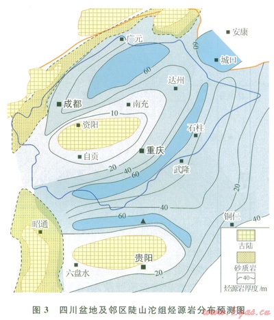 四川盆地腹部僅有少量鉆井鉆遇該層系,且厚度薄,因而這套烴源巖在盆地分布往往不被看好。近期,筆者根據(jù)盆地區(qū)域地震的層位解釋,發(fā)現(xiàn)燈影組底界以下的反射層具有向古隆起超覆沉積的特征,層位應歸屬陡山沱組。這表明陡山沱沉積期,上揚子地區(qū)存在兩個同沉積期古隆起,分別是黔中隆起和樂山—龍女寺古隆起陡山沱組烴源巖在古坳陷區(qū)厚度較大,而隆起區(qū)厚度明顯減薄。圖3是筆者根據(jù)地震解釋結(jié)合露頭剖而資料推測的陡山沱組烴源巖分布圖。從圖3可以看出,資陽古隆起兩側(cè)的川西、川東地區(qū)均存在陡山沱組烴源巖,厚度在20~60m。這一認識大大提升了震旦系含油氣系統(tǒng)的資源潛力。