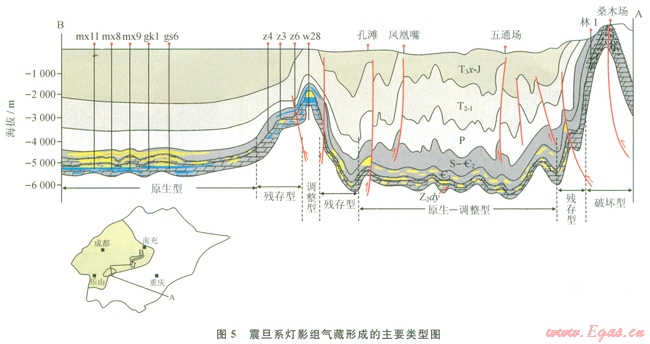 新近紀以來的喜馬拉雅運動,對盆地深層震旦系產(chǎn)生4種變形方式:①強烈的褶皺沖斷作用變形,主要發(fā)生在盆地周緣,導致震旦系出露地表,如盆地東南緣的桑木場構(gòu)造;②強烈褶皺、隆升,但震旦系未遭受剝蝕,如威遠地區(qū)隆升幅度較高(3000~4000m)[30];③中淺層變形強烈,但震旦系未卷入變形或變形微弱,如川東、蜀南地區(qū);④深層及中淺層均未卷入變形或變形微弱,如磨溪—高石梯地區(qū)。除第一變形方式對震旦系氣藏起破壞作用之外,其余的變形對震旦系氣藏調(diào)整有影響,但未被破壞?;诖?,可將喜山期震旦系氣藏可分為調(diào)整型(如威遠氣田)、殘存型(如資陽地區(qū))、原生型(如磨溪 高石梯氣田)、原生—調(diào)整型(如蜀南深層)(圖5)。按此評價有利勘探區(qū)帶,磨溪—高石梯廣安一帶長期處于古今構(gòu)造疊合的高部位,是最有利勘探區(qū);有利區(qū)為遂寧—南充斜坡帶,較有利區(qū)為川東—蜀南深層。