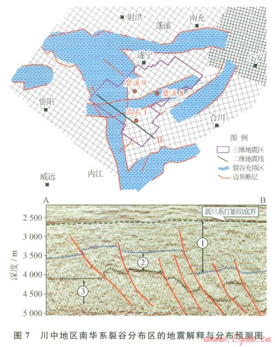 根據(jù)對川中地區(qū)震旦系燈影組以下層位的地震反射特征解釋,可以進一步識別出裂谷形態(tài)及分布特征。圖7可以看出在南充—遂寧之間、磨溪地區(qū)存在近東西向裂谷,而高石梯以西存在近南北向裂谷。根據(jù)3D地震反射特征,可以將裂谷區(qū)充填地層劃分為3的反射層組(圖7)。①反射層組為較連續(xù)反射,成層性好,厚度變化較大,地震反射時間介于600~1300ms;②反射層組為斷續(xù)反射,底界反射波組連續(xù)性較強,可能是某個地層界面的反射特征;③反射層組為雜亂反射。從解釋的斷裂來看,既有正斷層也有逆斷層,反映裂谷區(qū)經(jīng)歷了復雜的構(gòu)造演化歷史。當然,區(qū)內(nèi)的地震解釋方案尚沒有得到鉆井證實,有待進一步深化研究。