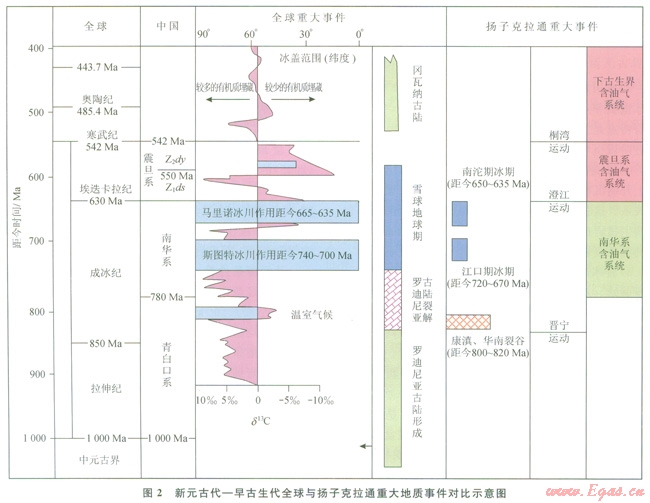 新元古代到早寒武世時期,全球發(fā)生了一系列重大地質(zhì)事件[13-18]:①羅迪(Rodinia)超級古陸的形成、穩(wěn)定和初始破裂,發(fā)生在距今大約750Ma前的拉伸紀至早成冰世;②全球性冰川作用,發(fā)生在中成冰世至早埃迭卡拉世階段(距今750~600Ma),包括兩次重大冰川作用,斯圖特冰川作用和馬里諾冰川作用;③岡瓦納超級古陸的形成和穩(wěn)定,發(fā)生在中埃迭卡拉世至早寒武世階段(距今約600Ma以后)。
