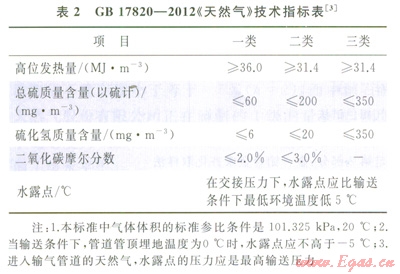 GB l7820規(guī)定了經(jīng)過處理并通過管道輸送的商品天然氣分類和技術(shù)要求[3],為天然氣工業(yè)的發(fā)展制定了一個(gè)統(tǒng)一的產(chǎn)品要求(表2)。其中發(fā)熱量、總硫含量、硫化氫含量、二氧化碳含量和水露點(diǎn)5項(xiàng)關(guān)鍵控制性技術(shù)指標(biāo)體現(xiàn)安全衛(wèi)生、環(huán)保和經(jīng)濟(jì)效益要求,而一類氣指標(biāo)與歐、美、俄處于同等水平,實(shí)現(xiàn)與國際接軌,保障了進(jìn)口天然氣質(zhì)量,為天然氣質(zhì)量控制提供了依據(jù)。