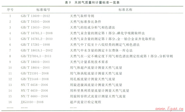 為配合GB l7820《天然氣》和GB/T l8603《天然氣計(jì)量系統(tǒng)技術(shù)要求》的實(shí)施,先后制定了天然氣取樣、組成分析、物性計(jì)算、能量測定、流量檢測等50余項(xiàng)國家和行業(yè)標(biāo)準(zhǔn)(表5),初步構(gòu)建了以GB l7820《天然氣》和GB/T l8603《天然氣計(jì)量系統(tǒng)技術(shù)要求》為核心的質(zhì)量和計(jì)量技術(shù)標(biāo)準(zhǔn)體系,整體達(dá)到國際先進(jìn)水平。
