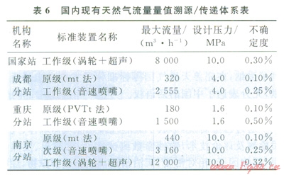 20世紀(jì)80年代,我國開始在四川成都建設(shè)天然氣流量標(biāo)準(zhǔn)裝置。l996年通過自主研發(fā),建成質(zhì)量時(shí)間法原級標(biāo)準(zhǔn)裝置,達(dá)到“90年代中期國際同類裝置的先進(jìn)水平”(亞洲一流)。目前,已建立0.1%的原級標(biāo)準(zhǔn)及配套的傳遞標(biāo)準(zhǔn)和工作標(biāo)準(zhǔn)裝置,形成了完整的量傳溯源體系(表6)。