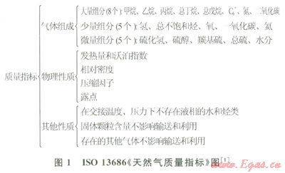 國際標(biāo)準(zhǔn)化組織(ISO)于1998年發(fā)布ISO13686《天然氣質(zhì)量指標(biāo)》,成為全世界天然氣質(zhì)量控制的指導(dǎo)性準(zhǔn)則和各國之間簽訂天然氣貿(mào)易合同的指南。該國際標(biāo)準(zhǔn)明確規(guī)定了天然氣質(zhì)量必須滿足安全衛(wèi)牛、環(huán)境保護(hù)、經(jīng)濟(jì)利益3個(gè)方面要求。其對天然氣質(zhì)量控制參數(shù)、測量單位和測量方法標(biāo)準(zhǔn)進(jìn)行了規(guī)定(圖1) [1]。