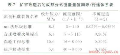 在現(xiàn)有天然氣流量量傳溯源體系的基礎(chǔ)上,通過成都分站的擴(kuò)容改造,進(jìn)一步提高技術(shù)水平和能力,躋身國際先進(jìn)行列。成都分站擴(kuò)容改造后,將建立中低壓(0.3~6.0MPa)、質(zhì)量流量不確定度為0.05%~0.076%的原級標(biāo)準(zhǔn)裝置。新建的環(huán)道檢測系統(tǒng)作為工作標(biāo)準(zhǔn),將現(xiàn)有臨界流文丘里噴嘴次級標(biāo)準(zhǔn)裝置從不確定度0.33%水平提高到小于等于0.20%(表7)。