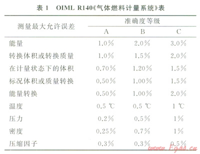 國際法制計(jì)量組織(OIML)于l998年發(fā)布Rl40《氣體燃料計(jì)量系統(tǒng)》[2],作為天然氣流量計(jì)量的指導(dǎo)性準(zhǔn)則和各國簽訂天然氣貿(mào)易合同的指南。該技術(shù)文件對天然氣流量計(jì)量系統(tǒng)準(zhǔn)確度等級和能量、質(zhì)量、體積、參數(shù)換算、壓力、溫度、密度、壓縮因子的測量最大允許誤差等技術(shù)要求進(jìn)行了詳細(xì)規(guī)定(表1) [2]。