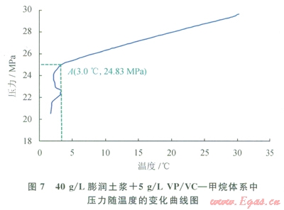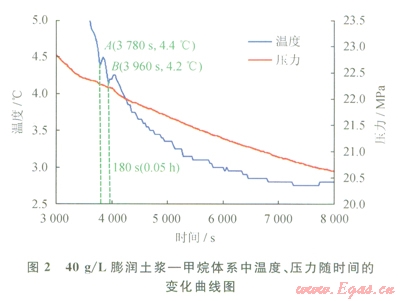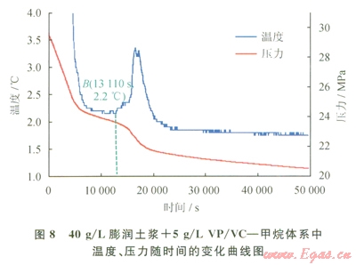 VP/VC屬于第二代天然氣水合物動(dòng)力學(xué)抑制劑,由N-乙烯基吡咯烷酮和N-乙烯基己內(nèi)酰胺共聚而成。圖7、8反映了加入VP/VC后膨潤(rùn)土漿中水合物的生成過(guò)程。