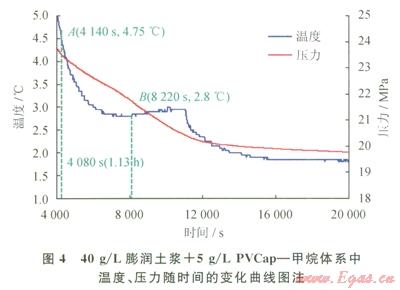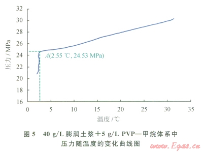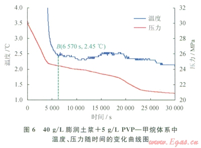 PVP作為第一代天然氣水合物動(dòng)力學(xué)抑制劑的代表,近年來(lái)應(yīng)用較多。圖5、6反映了加入PVP后膨潤(rùn)土漿中水合物的生成過(guò)程。