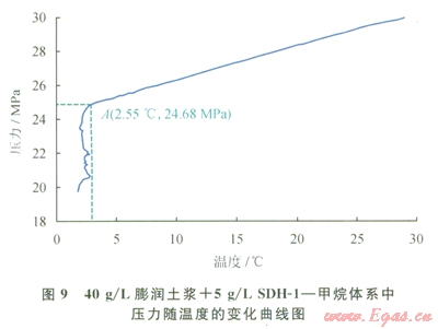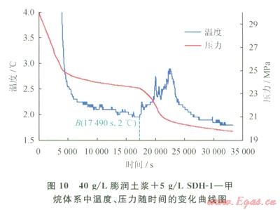 三元聚合物抑制劑SDH-l在VP/VC分子結(jié)構(gòu)基礎(chǔ)上引入了強(qiáng)親水性基團(tuán),以增加聚合物的水溶性。圖9、10反映了加入SDH-1后膨潤(rùn)土漿中水合物的生成過(guò)程。
