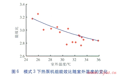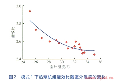模式1下熱泵機(jī)組制冷性能系數(shù)隨室外溫度的變化見圖l,圖中紅色點(diǎn)為實(shí)測(cè)數(shù)據(jù)點(diǎn),平滑曲線為擬合曲線:ICOP=0.0046q2-0.3224q2+8.2426,q為室外溫度(單位為℃)。由圖1可知,模式1下熱泵機(jī)組制冷性能系數(shù)隨室外溫度的升高而降低,且下降速率較快。這說(shuō)明空氣源熱泵的性能易受室外溫度影響,當(dāng)室外溫度升高時(shí),冷凝器的工作環(huán)境惡化,制冷劑甚至不能及時(shí)液化,直接導(dǎo)致熱泵機(jī)組的制冷性能系數(shù)下降。模式l下熱泵機(jī)組能效比隨室外溫度的變化見圖2,圖中紅色點(diǎn)為實(shí)測(cè)數(shù)據(jù)點(diǎn),平滑曲線為擬合曲線:IEER=0.0038q2-0.2606q+7.0016。由圖1、2可知,模式1下熱泵機(jī)組能效比隨室外溫度的升高而降低,變化趨勢(shì)與制冷性能系數(shù)基本一致。