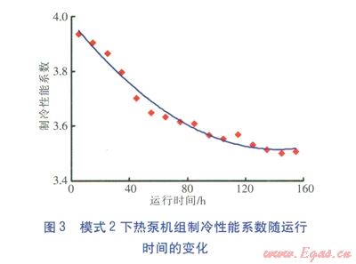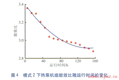 模式2下熱泵機(jī)組制冷性能系數(shù)隨運(yùn)行時(shí)間的變化見圖3,圖中紅色點(diǎn)為實(shí)測(cè)數(shù)據(jù)點(diǎn),平滑曲線為擬合曲線:ICOP=2×10-5t2-0.0065t+3.981,t為運(yùn)行時(shí)間(單位為h)。由圖3可知,模式2下,雖然熱泵機(jī)組制冷性能系數(shù)隨運(yùn)行時(shí)間的延長(zhǎng)呈下降趨勢(shì),且下降速率較快,但有趨于平穩(wěn)的趨勢(shì)。模式2下熱泵機(jī)組能效比隨運(yùn)行時(shí)間的變化見圖4,圖中紅色點(diǎn)為實(shí)測(cè)數(shù)據(jù)點(diǎn),平滑曲線為擬合曲線:IEER=2×10-5t2-0.0066t+3.3975。由圖3、4可知,模式2下熱泵機(jī)組能效比與制冷性能系數(shù)的變化趨勢(shì)基本一致。