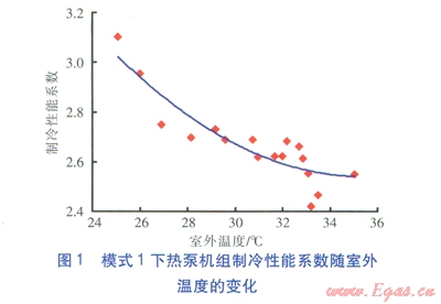 地埋管內(nèi)傳熱介質(zhì)的質(zhì)量流量設(shè)定為2.35t/h,冷水質(zhì)量流量設(shè)定為3.01t/h。選取室外溫度比較接近時(shí)段(變化范圍為25~36℃)的測(cè)試數(shù)據(jù)進(jìn)行比較。當(dāng)運(yùn)行模式涉及風(fēng)冷冷凝器時(shí),主要考慮室外溫度對(duì)熱泵機(jī)組性能的影響。當(dāng)水冷冷凝器單獨(dú)運(yùn)行時(shí),由于空氣溫度對(duì)土壤溫度影響較小,主要考慮運(yùn)行時(shí)間對(duì)熱泵機(jī)組性能的影響。