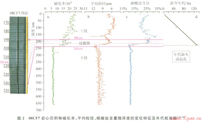08CF7巖心在琴叁和取樣過程中未遭到人為破壞,且未見明顯生物擾動痕跡,因此能較好地指示其原位沉積特征。巖心觀察發(fā)現(xiàn),沉積物白頂向下以216cm處為界,上部為灰黑色,下部為淺黑色,交界面呈相互穿透狀,整段巖心的沉積物類型均為黏土質(zhì)粉砂。筆者在前期的研究中已對巖心沉積物進行粒度、磁化率和碳酸鹽含量測定和分析[34-35],將結(jié)果進行綜合對比和分析,發(fā)現(xiàn)這3項指標(biāo)均呈現(xiàn)出相似的變化趨勢,可分為3段:①0~188cm段,各項指標(biāo)變化較大,以磁化率值高,沉積物粒度小及碳酸鹽含量高為特征;②188~240cm段,為各項指標(biāo)和沉積物巖性變化的過渡段;③240cm以下,各項指標(biāo)呈現(xiàn)均一性變化,相對以磁化率值低,沉積物較粗及碳酸鹽含量低為特征(圖2)。