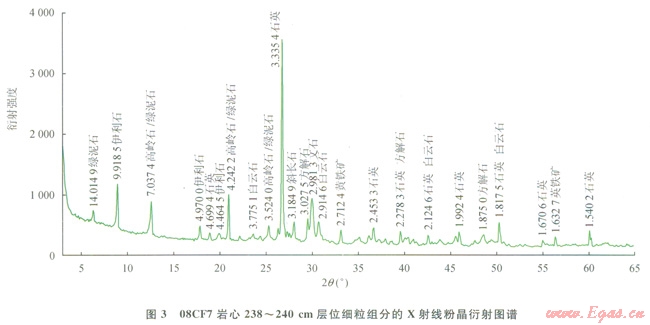20個代表性樣品細(xì)粒組分的X射線衍射(XRD)結(jié)果見圖3和表l。細(xì)粒組分的礦物組成主要為伊利石、綠泥石(高嶺石)等黏土礦物,其占細(xì)粒組分總量的33.3%~55.5%,平均含量為43.9%,黏土礦物總含量變化不大,但巖心上部樣品的黏土總含量略高,中間部分樣品則較少。細(xì)粒組分中的其他礦物主要有石英、長石、黃鐵礦以及方解石、文石、白云石等碳酸鹽類礦物。
