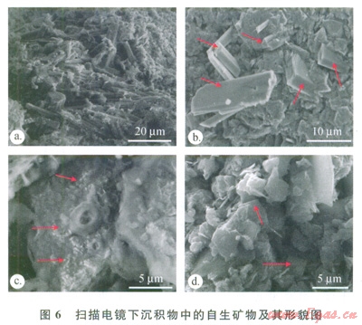自生碳酸鹽礦物主要呈細(xì)粒狀發(fā)育在沉積物中,在掃描電子顯微鏡下,原樣中的文石呈針狀生長在沉積物中(圖6-a),沒有發(fā)現(xiàn)沿孔隙生長的簇狀文石,而在細(xì)粒組分中,文石呈碎屑狀出現(xiàn)(圖6-b)。白云石呈微晶狀發(fā)育在黏土團塊中(圖6-c),周圍有l0mm的滲漏微孔。在原樣中沒有觀察到方解石顆粒,但在細(xì)粒組分中可觀察到方解石呈棱形體零星地散布在細(xì)粒組分中(圖6-d),顆粒一般為2~15mm。這些觀察表明,沉積物中發(fā)育自生碳酸鹽礦物,但其顆粒細(xì)小且分散在沉積物中,未發(fā)育成塊狀碳酸鹽巖。