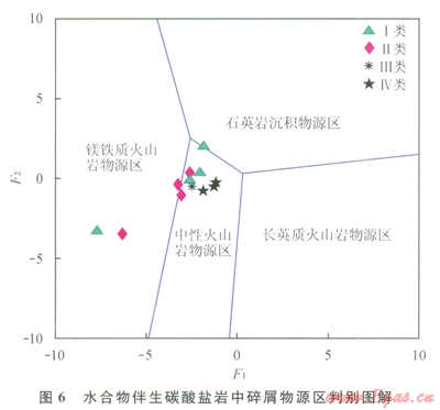 Roser和Korsch[28]曾提出通過(guò)沉積巖中Ti、Fe、Mg、Na、K氧化物含量對(duì)Al2O3含量比值作為判別函數(shù),來(lái)區(qū)分沉積巖碎屑物源區(qū)是鐵鎂質(zhì)、中性、長(zhǎng)英質(zhì)火山巖和石英巖4種沉積物源區(qū)(圖6)。判別函數(shù)F1=30.638TiO2/Al2O3-12.54Fe2O3/Al2O3+7.329MgO/Al2O3+12.031Na2O/Al2O3+35.402K2O/A12O3-6.382;判別函數(shù)F2=36.500TiO2/Al2O3-10.879Fe2O3/Al2O2+30.875MgO/Al2O3-5.404Na2O/Al2O3+11.112K2O/Al2O3-3.89[29-30]。從圖6中看出,祁連山凍土區(qū)4類碳酸鹽巖中碎屑大部分為中性火山巖物源區(qū)。其中,第Ⅱ類碳酸鹽巖中的碎屑部分顯示中性火山巖物源區(qū)與鎂鐵質(zhì)火山巖物源區(qū)交界處,更偏于鎂鐵質(zhì)火山巖物源區(qū)。這與前述分析相一致,即該類碳酸鹽巖中黏土類礦物在沉積中貢獻(xiàn)較小,該類碳酸鹽巖中åREE平均含量最低(103.61mg/g),顯示為Eu正異常。