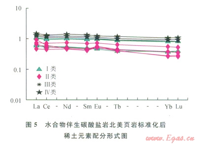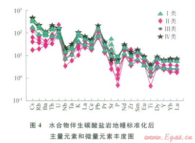 巖石化學(xué)蝕變指數(shù)(CIA)——CIA指數(shù)=[Al2O3/(A12O3+CaO+Na2O+K2O)]×100,表達(dá)了Al2O3(含鋁黏土礦物)、(CaO+Na2O)(斜長(zhǎng)石)和K2O(鉀長(zhǎng)石)含量之間的變化關(guān)系,反映出沉積烴源巖特征[27]。該區(qū)4類碳酸鹽巖樣品中CIA指數(shù)分別約為32、36、44、72,第Ⅰ類和第Ⅱ類碳酸鹽巖中混入的碎屑部分程度最弱,因?yàn)檫@個(gè)原因,第Ⅱ類碳酸鹽巖樣品中稀土元素含量最低(其平均約為l03.61mg/g,而第Ⅰ、Ⅲ、Ⅳ類碳酸鹽巖樣品中稀土元素含量分別約為137.48mg/g、197.83mg/g、230.07mg/g),其樣品中主量元素和微量元素含量也相對(duì)最低(表3、4),即表明黏土礦物對(duì)該類碳酸鹽巖形成過(guò)程中的貢獻(xiàn)最小。