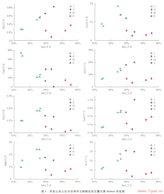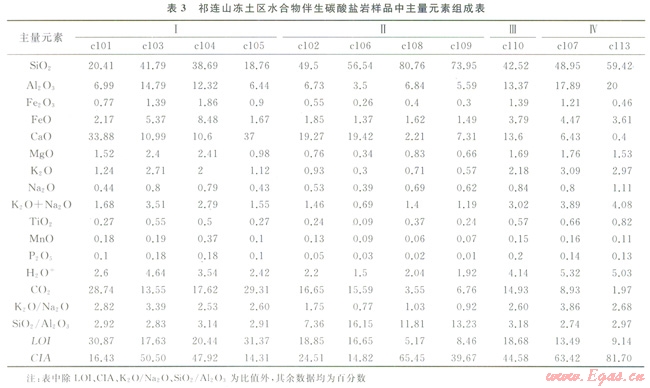 近幾年,在祁連山凍土區(qū)水合物科學(xué)試驗(yàn)鉆探過(guò)程中,觀察到大量與水合物伴生的碳酸鹽礦物,這些伴生碳酸鹽礦物(或部分)是否與水合物存在著某種成因上的聯(lián)系,還不得而知。由于碳酸鹽礦物?;煊兴樾汲练e且難以與碎屑沉積分選開來(lái),筆者以祁連山凍土區(qū)新近發(fā)現(xiàn)的與水合物伴生碳酸鹽礦物及其混雜的碎屑沉積(統(tǒng)稱碳酸鹽巖)為研究對(duì)象,從分析伴生碳酸鹽礦物所在沉積巖中主量元素、微量元素、稀土元素等特征入手,探討伴生碳酸鹽礦物可能物質(zhì)來(lái)源與沉積條件,試圖揭示不同產(chǎn)狀伴生碳酸鹽巖同水合物的內(nèi)在成因聯(lián)系。