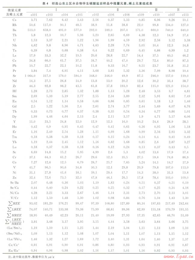 野外鉆探取樣過(guò)程中發(fā)現(xiàn)水合物常與碳酸鹽巖伴生,這一現(xiàn)象暗示了水合物可能與碳酸鹽巖之間存在著某種聯(lián)系。海底水合物分布區(qū)中伴生碳酸鹽巖中的碳普遍認(rèn)為主要來(lái)源于水合物分解釋放的甲烷,其次還可能來(lái)源于滲漏的甲烷氣體,或深部滲漏的重?zé)N(油)、沉積物中有機(jī)質(zhì)等被氧化產(chǎn)物。對(duì)祁連山凍土區(qū)伴生碳酸鹽巖中C、O同位素研究表明,第Ⅰ、Ⅲ、Ⅳ類伴生碳酸鹽巖巾碳、氧同位素組成相關(guān),而第Ⅱ類伴生碳酸鹽巖中碳、氧同位素組成相對(duì)獨(dú)立,第Ⅱ類伴生碳酸鹽巖組成明顯不同于第Ⅰ、Ⅲ、Ⅳ類伴生碳酸鹽巖[31],其伴生碳酸鹽巖礦物如方解石、文石、白云石中13C較大程度虧損指示著甲烷是其碳酸鹽巖的一個(gè)主要碳源[32-33]。顯微鏡下觀察發(fā)現(xiàn),第Ⅱ類碳酸鹽巖中產(chǎn)出較多草莓狀黃鐵礦,這些特征表明有微生物參與沉積成巖,這也造成第Ⅱ類碳酸鹽巖元素地球化學(xué)特征有別于其他類型碳酸鹽巖。