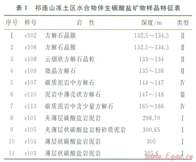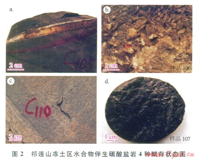 實(shí)際中,祁連山凍土區(qū)與水合物伴生的第Ⅰ、Ⅲ、Ⅳ類碳酸鹽巖在鉆孔中產(chǎn)出深度在144~305m,主要屬江倉(cāng)組,為l套淺湖—半深湖環(huán)境的細(xì)碎屑泥巖、粉砂巖等。其中,第Ⅰ類碳酸鹽巖旱白色薄層狀?yuàn)A層產(chǎn)出在泥巖層中,厚度介于3~5cm(圖2-a),第Ⅲ類碳酸鹽巖呈深灰色薄殼狀產(chǎn)出在泥巖微裂隙中,厚度一般小于1mm(圖2-c),第Ⅳ類碳酸鹽巖呈微細(xì)浸染狀賦存于炭質(zhì)(鈣質(zhì))泥巖等中(圖2-d),該類碳酸鹽巖所在巖層新鮮面上肉眼可見白色絲狀非晶質(zhì),點(diǎn)滴鹽酸時(shí)出現(xiàn)強(qiáng)烈冒泡現(xiàn)象。