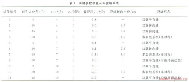 在定向射孔方位角由小變大的過程中,發(fā)現(xiàn)存在一個臨界角度,此時,定向射孔處和最大水平地應力方向處的第一主應力的大小相等,裂縫可能會同時在這兩個位置起裂[1,3]。實驗表明:在試件4、試件7和試件10中產(chǎn)生了非對稱多裂縫系統(tǒng),井眼一側(cè)是一條沿定向射孑乙起裂的轉(zhuǎn)向裂縫和一條白射孔孔眼根部與井壁的交匯處起裂、穿透水泥環(huán)一段距離后沿sH方向與井壁的交匯處起裂、延伸的單翼平直裂縫,井眼的另一側(cè)是沿定向射孔起裂的轉(zhuǎn)向裂縫(圖3)。而且在地應力狀態(tài)一定的情況下,隨著定向射孔方位角的增大,由于水力裂縫的起裂困難和彎曲,產(chǎn)生人工水力裂縫所需的破裂壓力逐漸變大、水力裂縫的轉(zhuǎn)向半徑也越來越大;在產(chǎn)生非對稱多裂縫時,破裂壓力和裂縫轉(zhuǎn)向半徑均達到實驗的最大值(表1)。