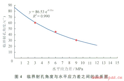 利用本壓裂模擬實驗結(jié)果,可回歸出產(chǎn)生非對稱多裂縫系統(tǒng)的臨界射孔角度和水平應力差的相互關系曲線(圖4)。當水平應力差和定向射孔方位角的坐標落在藍色臨界線的左下側(cè)時,人工水力裂縫會沿定向射孔方向起裂,形成一條基本對稱的雙翼平直裂縫或雙翼彎曲裂縫;當水平應力差和定向射孔方位角的坐標落在藍色臨界線的右上側(cè)時,人工水力裂縫會沿著最大水平地應力方向起裂,產(chǎn)生一條穿過微環(huán)面的雙翼平直裂縫;當水平應力差和定向射孔方位角的坐標正好落在藍色臨界線上時,人工水力裂縫可能沿著定向射孔方向和最大水平地應力方向多點同時起裂,形成非對稱多裂縫系統(tǒng)。該預測結(jié)果與本文參考文獻[3]的有限元模擬計算結(jié)果比較一致。運用該圖可以用來預測定向射孔水力壓裂裂縫形態(tài),為現(xiàn)場壓裂施工提供參考。但鑒于實際地層因素和完井因素的影響,實際的臨界射孔角度可能會有所變化。