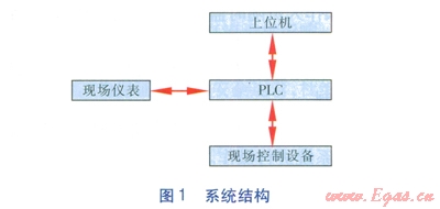 該系統(tǒng)中現(xiàn)場(chǎng)儀表及控制設(shè)備通過PLC通信將實(shí)時(shí)情況反饋給上位機(jī),并在上位機(jī)顯示相關(guān)數(shù)據(jù)。上位機(jī)通過PLC通信將指令發(fā)送到現(xiàn)場(chǎng)控制設(shè)備,對(duì)其進(jìn)行自動(dòng)控制。