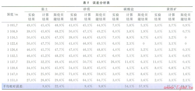 表5是對幾種主要礦物含量計算結(jié)果的誤差分析。從表5中可以看出,對于含量大于20%的黏土和砂質(zhì),筆者計算的礦物含量的平均相對誤差分別為9.6%和9.4%,均小于10%。雖然碳酸鹽和黃鐵礦的平均相對誤差較大,但由于這兩種礦物含量較少,這樣的結(jié)果也是可以接受的。與斯倫貝謝Spectrolith模型計算的結(jié)果相比,筆者計算的4種礦物的平均相對誤差均小于斯倫貝謝計算結(jié)果。