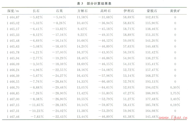 從表3中可以看出該結(jié)果中多種礦物含量為負(fù)值,且有的礦物含量為大于l00%的值,這樣的結(jié)果顯然是不合理的。經(jīng)分析檢驗(yàn),修正后的轉(zhuǎn)換系數(shù)矩陣條件數(shù)較大,為病態(tài)方程組,所以用一般的數(shù)值解法會有較大的誤差,甚至嚴(yán)重失真。所以需要根據(jù)本地區(qū)巖心的資料對轉(zhuǎn)換系數(shù)做更進(jìn)一步的校正。