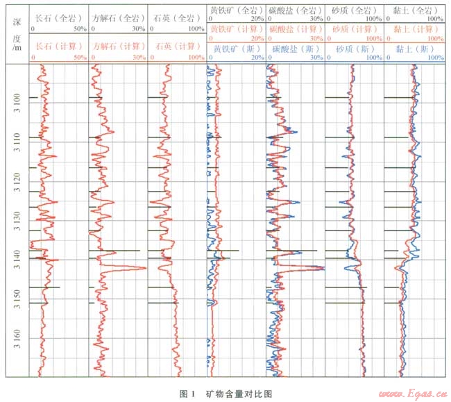碳組分碳酸鹽則由鈣組分的測量中精準(zhǔn)地獲得,石膏鹽則由Ca和S的測量來確定,地層中的剩余組分則為QFM(石英+長石+云母)[7-8]。從圖1中可以看出,筆者計算得到的砂質(zhì)與斯倫貝謝計算的砂質(zhì)吻合的非常好,變化趨勢基本一致;黏土和碳酸鹽吻合較好,整體變化趨勢一致;而黃鐵礦吻合效果較差,但筆者計算的結(jié)果與全巖分析的吻合效果優(yōu)于斯倫貝謝與全巖分析的吻合結(jié)果。