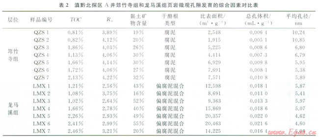泥貝巖微觀孔隙的發(fā)育演化,不是受單一的條件控制,而是巖性、礦物組合、溫壓等多方面因素影響的綜合體[5,26]。有機(jī)碳含量、干酪根類型、黏土礦物與含量、熱演化程度等因素,均不同程度地控制著泥頁巖微觀孔隙的發(fā)育[26]。通過荇類分析化驗的對比研究發(fā)現(xiàn),滇黔北高演化區(qū)筇竹寺組泥頁巖微觀孔隙的發(fā)育演化也與上述因素有著密切的關(guān)系。