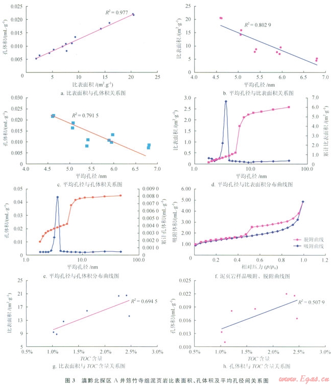 對滇黔北A井筇竹寺組泥頁巖樣品進(jìn)行了比表面積測量和孔徑在1.5~300.0nm樣品的孔體積測試,得出筇竹寺組頁巖氣儲層的比表面積為1.915~7.691m2/g.平均為5.185m2/g;孔體積為0.0051~0.0108mL/g,平均為0.0080mL/g;平均孔徑為5.38~10.85nm。反映筇竹寺組泥頁巖的比表面積和孔體積均較大。有利于頁巖氣的吸附。從中也可以看出,其孔比表而積與孔體積二者之間具有較好的正相關(guān)性,即隨著比表面積的增大。孔體積也隨之增大(圖3-a、3-b)。與之相反。比表面積、孔體積與平均孔徑則呈負(fù)相關(guān)性。即比表面積、孔體積均隨孔徑的增大而減小(圖3-c、3-d).且當(dāng)孔徑小于10nm時,孔體積分布曲線很陡,而當(dāng)孔徑大于等于10nm時,曲線則逐漸變得平緩,說明孔徑范圍在1~8nm內(nèi)的孔隙對泥頁巖比表而積、孔體積值的貢獻(xiàn)最大(圖3-c),即小孔隙越發(fā)育,頁巖的比表面積、孔體積越大,越有利于泥頁巖對頁巖氣的吸附聚集。