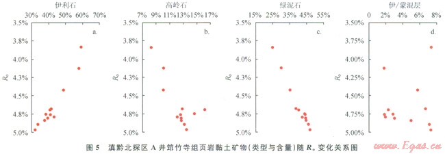 研究區(qū)筇竹寺組頁巖熱演化程度較高,R。均大于3.0%。根據(jù)巖心不同黏土礦物含量隨R。的變化關(guān)系圖(圖5)可以看出,隨R。的增大,具有較大比表面積的伊利石含量增大、伊/蒙混層含量減少,具有較小比表面積的綠泥石含量增大、高嶺石含量增大。而上覆的龍馬溪組頁巖熱演化程度相對低些(R。多小于3.0%),與筇竹寺組頁巖黏土礦物相比,其伊利石含量高(13%~36%)、伊/蒙混層含量比較少(2%~6%)、綠泥石含量高(13%~32%)、高嶺石含量高(6%~9%)。因而出現(xiàn)了筇竹寺組黏土礦物間微孔隙的比表面積和孔體積遠(yuǎn)比龍馬溪組小的情形,導(dǎo)致其比表面積和孔體積均較小的狀況(表2)。因此,熱演化程度通過對黏土礦物類型與含量的影響,也同樣控制著黏土礦物間微孔隙的發(fā)育程度。由此得出,已處于過成熟中期后的滇黔北筇竹寺組頁巖層,經(jīng)歷悠久的地質(zhì)作用過程和過高熱演化程度嚴(yán)重制約了其微觀孔隙結(jié)構(gòu)特征,呈現(xiàn)微孔隙驟減和比表面積、孔體積明顯較小的情形,不利于頁巖氣的吸附儲集,結(jié)果出現(xiàn)筇竹寺組頁巖氣富集程度不如龍馬溪組的狀況。