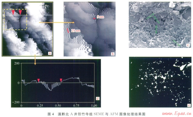 通過將A井筇竹寺組具有代表性的頁巖巖心拋光樣品進(jìn)行AFM和SEME圖像處理與分析,將圖像數(shù)據(jù)導(dǎo)入ArcGIS平臺中進(jìn)行柵格重分類分析,圖像中白色區(qū)域為孔隙或裂隙分布區(qū)(圖4-d、4-c)。由此計算出不同樣品中微觀孔隙的孔隙數(shù)量及其面孔率(表1)。與龍馬溪組頁巖相比,筇竹寺組頁巖具有微觀孔隙數(shù)量多、孔徑小、單孔面積小、而孔率大的特征。由AFM剖面圖清晰地顯示出,規(guī)則排列的柵格間為納米級孔隙,具有鋸齒狀緊密排列的結(jié)構(gòu)特征(圖4-a、4-c),這種規(guī)則的呈明暗相間的柵格狀表面形態(tài)特征可能是頁巖中干酪根大分子團(tuán)緊密排列的結(jié)果[27-28]。
