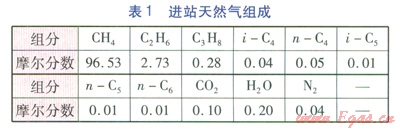 某城市的天然氣門站需將壓力為5.0MPa,溫度為25℃,流量為7.0×104m3/h(標(biāo)態(tài)為15.56℃,101325Pa)的高壓天然氣降壓到0.2MPa,其調(diào)壓過(guò)程采用圖l所示的天然氣部分液化調(diào)峰型LNG生產(chǎn)工藝流程。進(jìn)站天然氣組成見表1。