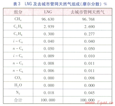調(diào)試流程直至收斂,得到計(jì)算結(jié)果見表2,LNG及去城市管網(wǎng)天然氣組成見表3。