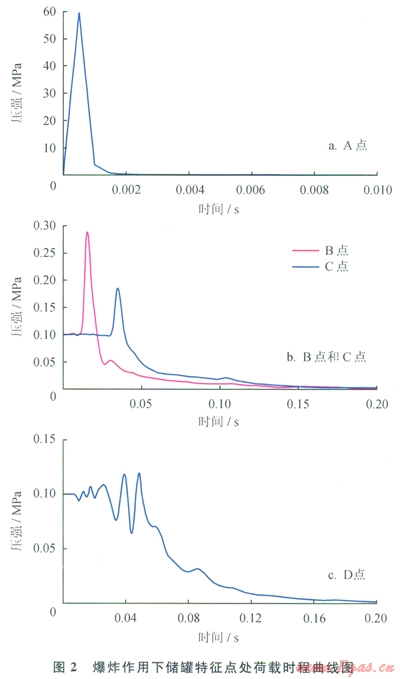 儲罐各特征點(diǎn)處在爆炸作用下的荷載時(shí)程曲線如圖2所示,由于E、F兩點(diǎn)距離爆心較遠(yuǎn),其超壓現(xiàn)象不明顯,本文并未示出這兩點(diǎn)的相應(yīng)曲線。比較前3個(gè)特征點(diǎn)的荷載時(shí)程曲線,其極值分別為59.15MPa、0.28MPa和0.18MPa;峰值出現(xiàn)時(shí)間分別為0.5ms、15.1ms和35ms;正壓區(qū)作用時(shí)間分別為2ms、8ms和10.5ms。本文參考文獻(xiàn)[14]中給出了裝藥密度為1630kg/m3時(shí)TNT炸藥所形成空氣沖擊波的初始值,其初始波后壓力為54.35MPa,傳播速度為6450m/s.