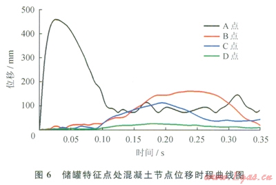 圖6為儲罐特征點(diǎn)A~D處混凝土節(jié)點(diǎn)位移時(shí)程曲線,E、F兩處位移響應(yīng)較小,此處未予列出。從圖6中可以看出,A點(diǎn)穹頂處最大位移達(dá)到了458mm,出現(xiàn)在25ms左右,說明穹頂處變形并不是在爆炸瞬間達(dá)到了最大位移響應(yīng),而是有一個(gè)逐漸變形的過程,最后其變形維持在100mm左右波動,證明穹頂各處發(fā)生了不可恢復(fù)變形,即穹頂混凝土已經(jīng)發(fā)生塑性破壞。B、C、D 3處的最大變形分別為164mm、113mm和27mm,各處均存在不同程度的殘余變形,但其值均較小,不影響結(jié)構(gòu)的整體安全?,F(xiàn)行國外規(guī)范并未對穹頂撓度限制有詳細(xì)規(guī)定,參考我國《混凝土結(jié)構(gòu)設(shè)計(jì)規(guī)范》[17]中的規(guī)定,穹頂處撓度限制應(yīng)小于l0/400,即80000/400=200mm。從以上分析中可以看出,穹頂處撓度已超過該值,雖未引起破壞,但結(jié)合其他數(shù)據(jù)可以看出基本已達(dá)到其承載力極限。