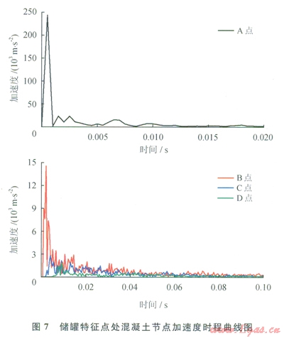 圖7為儲罐特征點(diǎn)A~D處混凝土節(jié)點(diǎn)加速度時(shí)程曲線。由圖7可見,各點(diǎn)加速度峰值均出現(xiàn)在初始加載階段,而后反應(yīng)大幅下降,并伴有鋸齒形劇烈振蕩,振蕩現(xiàn)象隨著爆心距的增加而愈加劇烈。這一現(xiàn)象的原因?yàn)檎ㄋ幈ê蠼o儲罐穹頂一個(gè)極大的初始加速度荷載,引起各特征點(diǎn)處加速度出現(xiàn)一個(gè)脈沖峰值,而后出現(xiàn)的鋸齒形振蕩則是由儲罐的自振引起的。將圖5~7與圖2的荷載時(shí)程曲線相對比,叮以看出,沖擊波波陣面的傳播對混凝土單元的應(yīng)力影響很大,但對于其加速度響應(yīng)影響不大。以C點(diǎn)為例,其荷載峰值出現(xiàn)在35ms處,此時(shí)其相應(yīng)的應(yīng)力出現(xiàn)了一個(gè)脈沖峰值,而其加速度響應(yīng)未有明顯波動。