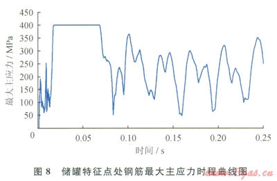 儲罐部分特征點(diǎn)B處鋼筋最大主應(yīng)力時(shí)程曲線如圖8所示,由于爆心處A點(diǎn)的鋼筋瞬間即達(dá)到設(shè)定的應(yīng)變極限不具代表性,故此處并未示出。圖8顯示B點(diǎn)的鋼筋一直處于較高的應(yīng)力水平,最大應(yīng)力已達(dá)到400MPa,但是未達(dá)到設(shè)置的應(yīng)變極限0.05,故尚未破壞,初始爆炸沖量并未使其到達(dá)應(yīng)力極值,后續(xù)的空氣沖擊波持續(xù)作用使其應(yīng)力逐漸增加。外罐鋼筋除爆心處發(fā)生破壞外,其余部分即使有瞬間到達(dá)應(yīng)力限值,但未達(dá)到設(shè)定的應(yīng)變極限,總體來說,外罐鋼筋應(yīng)力響應(yīng)較安全。