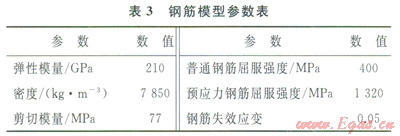 混凝土采用Johnson-Holmquit本構(gòu)模型,模型參數(shù)見表2。該模型因綜合考慮了損傷、應(yīng)變率、靜水壓以及壓碎、壓實(shí)效應(yīng),適合大應(yīng)變、高應(yīng)變率和高靜水壓情況,被廣泛地應(yīng)用于混凝土撞擊、侵徹和爆炸等強(qiáng)動載問題的數(shù)值模擬。鋼筋材料模型采用雙線性隨動硬化模型,用兩個(gè)斜率(彈性和塑性)來表示鋼筋的應(yīng)力應(yīng)變特性,具體參數(shù)見表3。