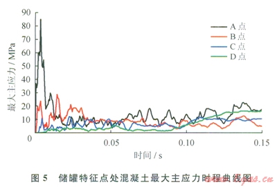 圖5為儲罐特征點(diǎn)的混凝土最大主應(yīng)力時(shí)程曲線。在A點(diǎn),其最大主應(yīng)力達(dá)到85MPa,但由于混凝土動態(tài)強(qiáng)度會比靜載強(qiáng)度有較大提高,故其并未發(fā)生破壞。B點(diǎn)的應(yīng)力曲線有兩個(gè)峰值,第一峰值的最大主應(yīng)力為23.2MPa,出現(xiàn)在2.5ms時(shí),即爆炸初期,與A點(diǎn)超壓峰值時(shí)間0.5ms十分接近。其原因在于爆炸初期,爆心處產(chǎn)生的初始空氣沖擊波作用于穹頂中心A點(diǎn),導(dǎo)致穹頂其余部位受到一脈沖作用而承受瞬時(shí)彎矩,表現(xiàn)為混凝土應(yīng)力響應(yīng)出現(xiàn)一個(gè)脈沖峰值。在15.5ms時(shí),B點(diǎn)又出現(xiàn)一個(gè)峰值為28.7MPa的峰值,這個(gè)峰值是由空氣沖擊波傳播到B點(diǎn)所斂,與荷載時(shí)程曲線中B點(diǎn)在15ms出現(xiàn)峰值相對應(yīng),隨后混凝土應(yīng)力出現(xiàn)大幅同落,并在應(yīng)力水平10MPa左右出現(xiàn)振蕩,這一現(xiàn)象是由負(fù)壓區(qū)的作用引起的。