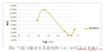 將數(shù)據(jù)按供氣量相近的原則分組(共分為3組:41—45、56—60、61—66,單位千萬立方米),每一組按氣溫升序排列。每組內(nèi)部近似忽略供氣量的影響,得到供氣量一定時(shí),氣溫與輸差的關(guān)系曲線如圖4—圖6所示。